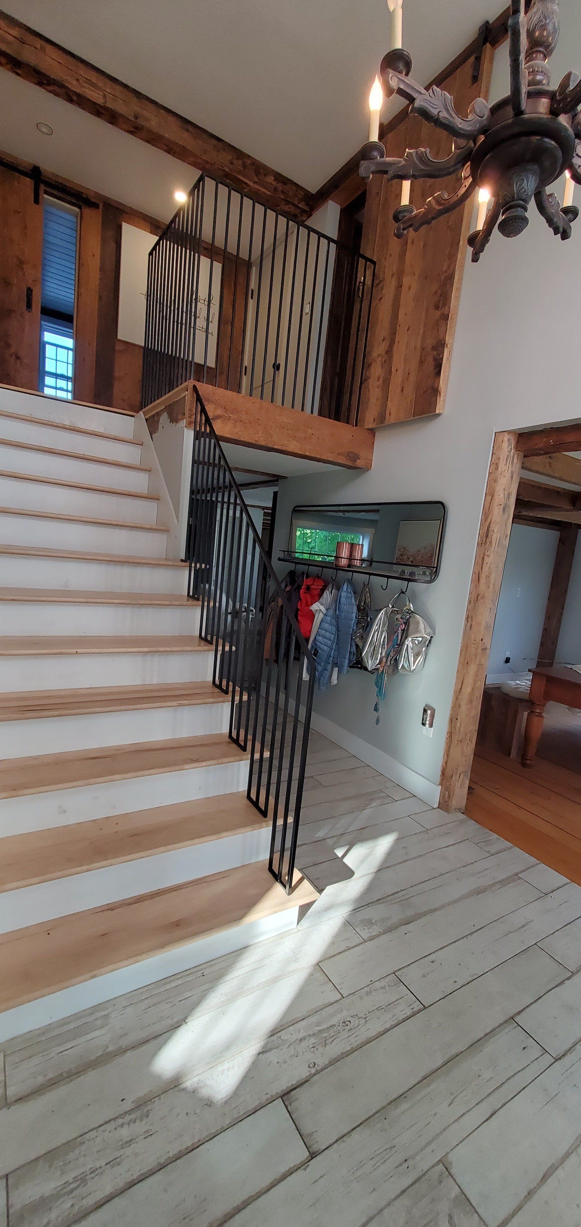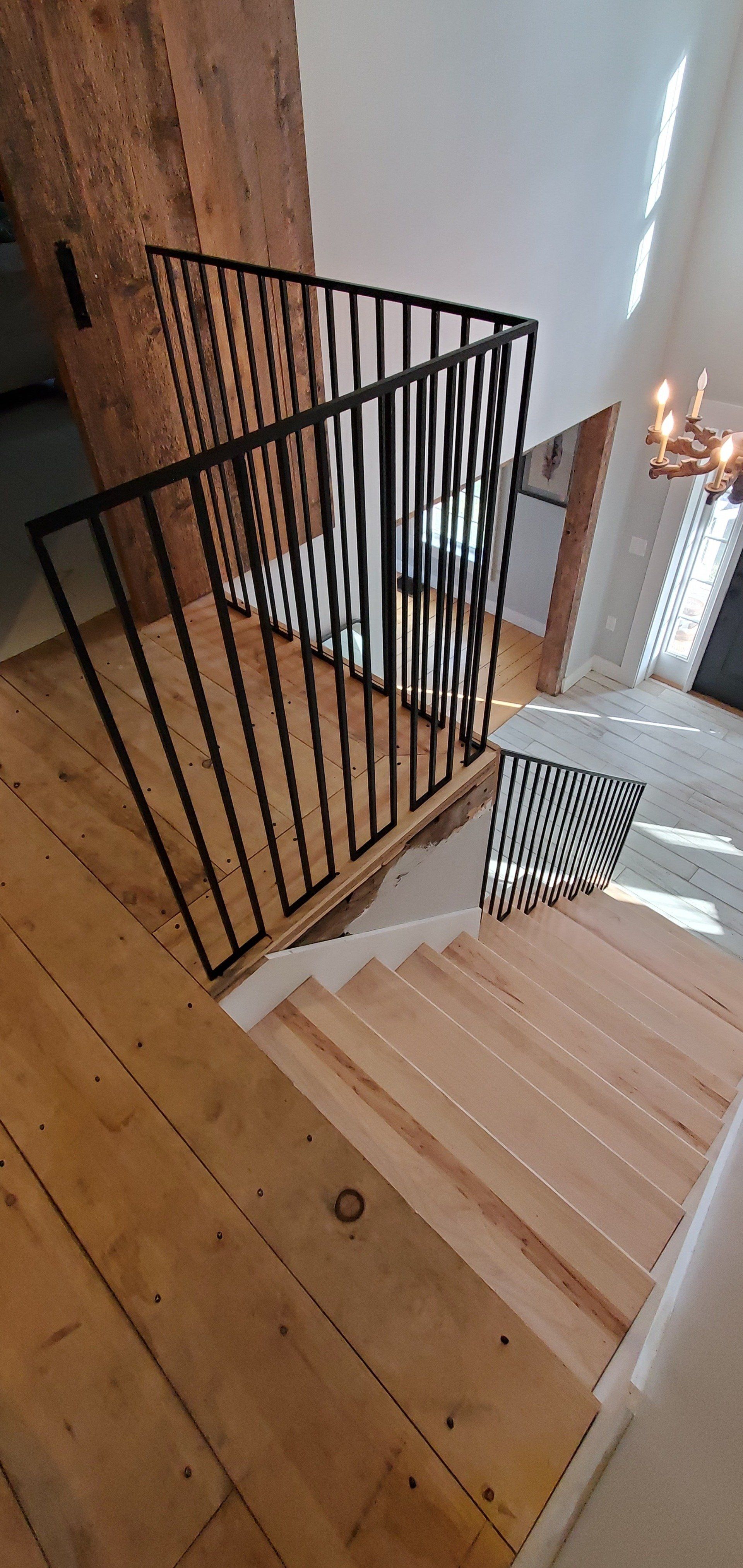 Another spectacular handrail and guardrail is complete for this beautiful farmhouse and the customer is blown away once again! This is a solid square bar handrail with a 3 bar spindle pattern. .5" spindles topped with .625" handrail.