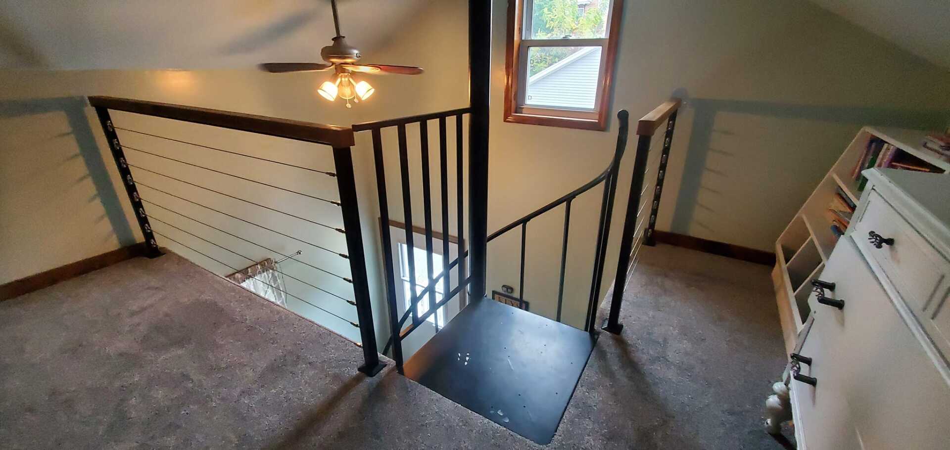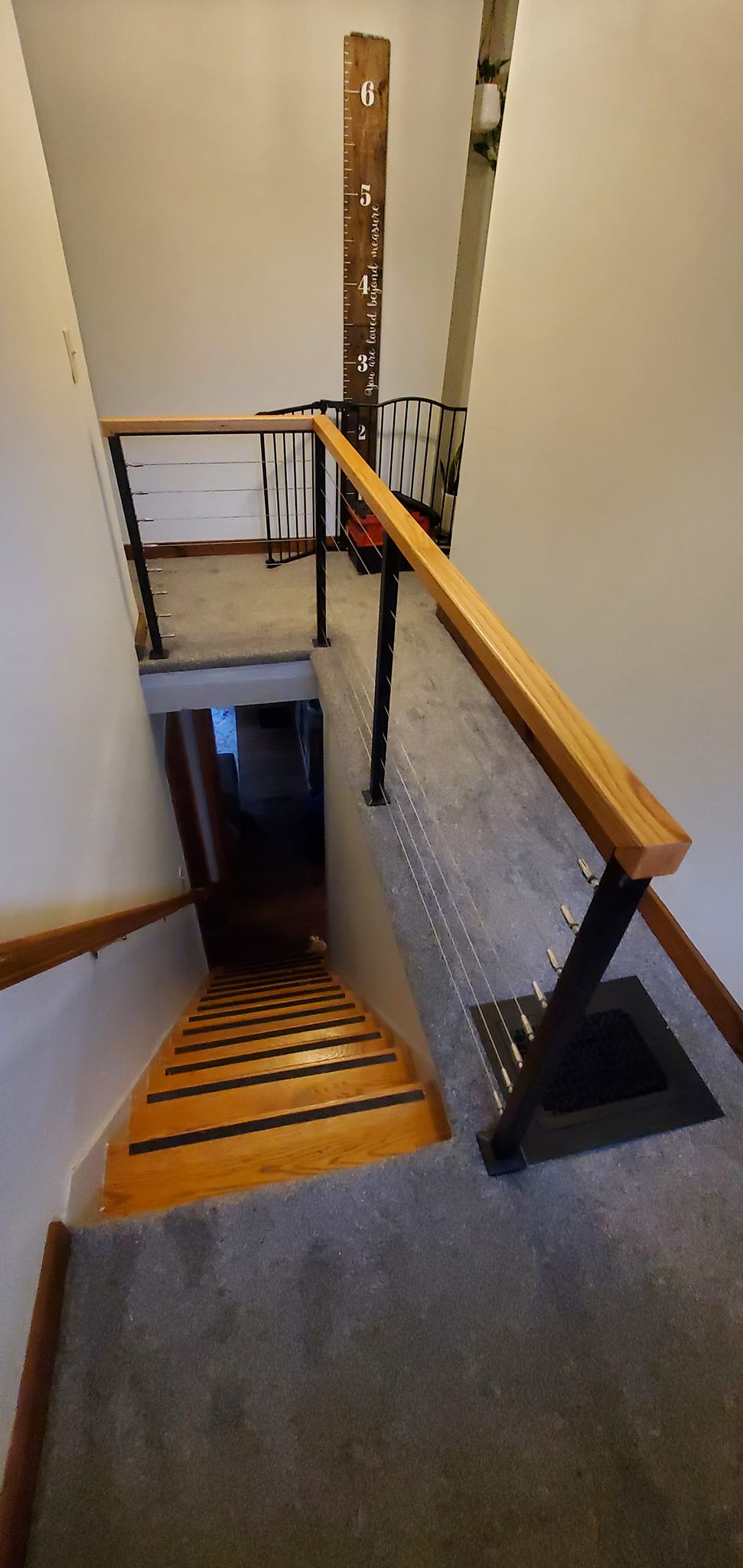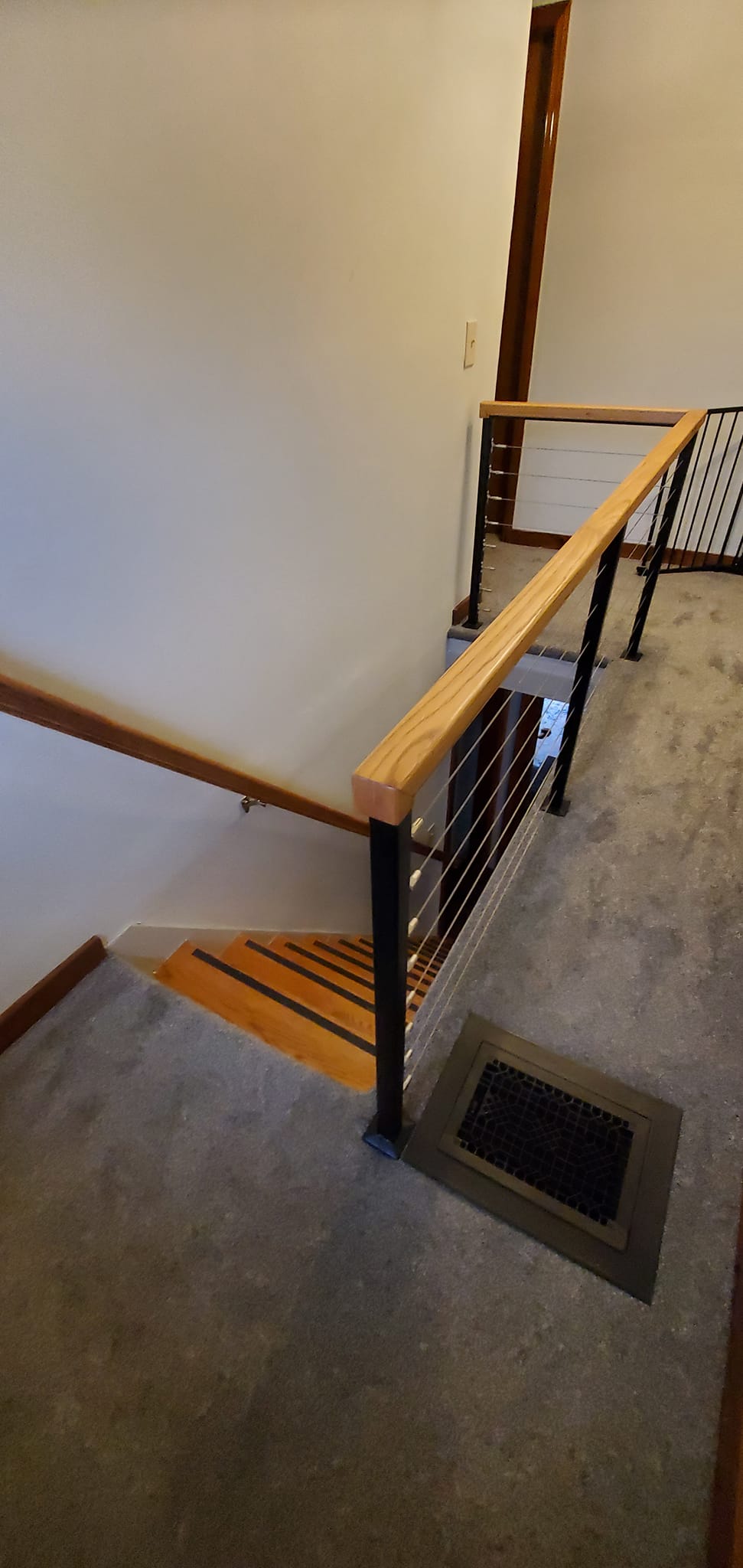 Our signature cable railing system capped with oak and finished with honey pine stain.