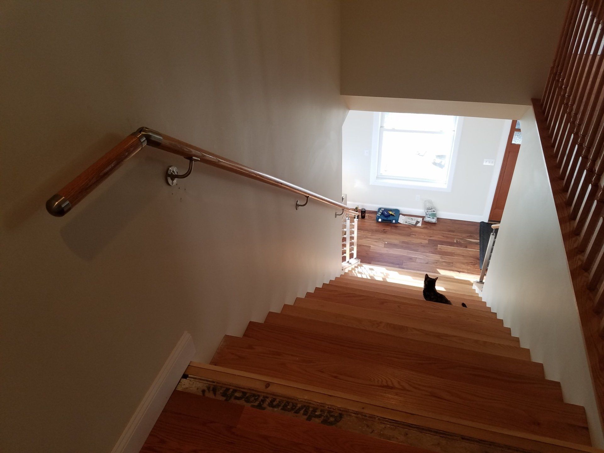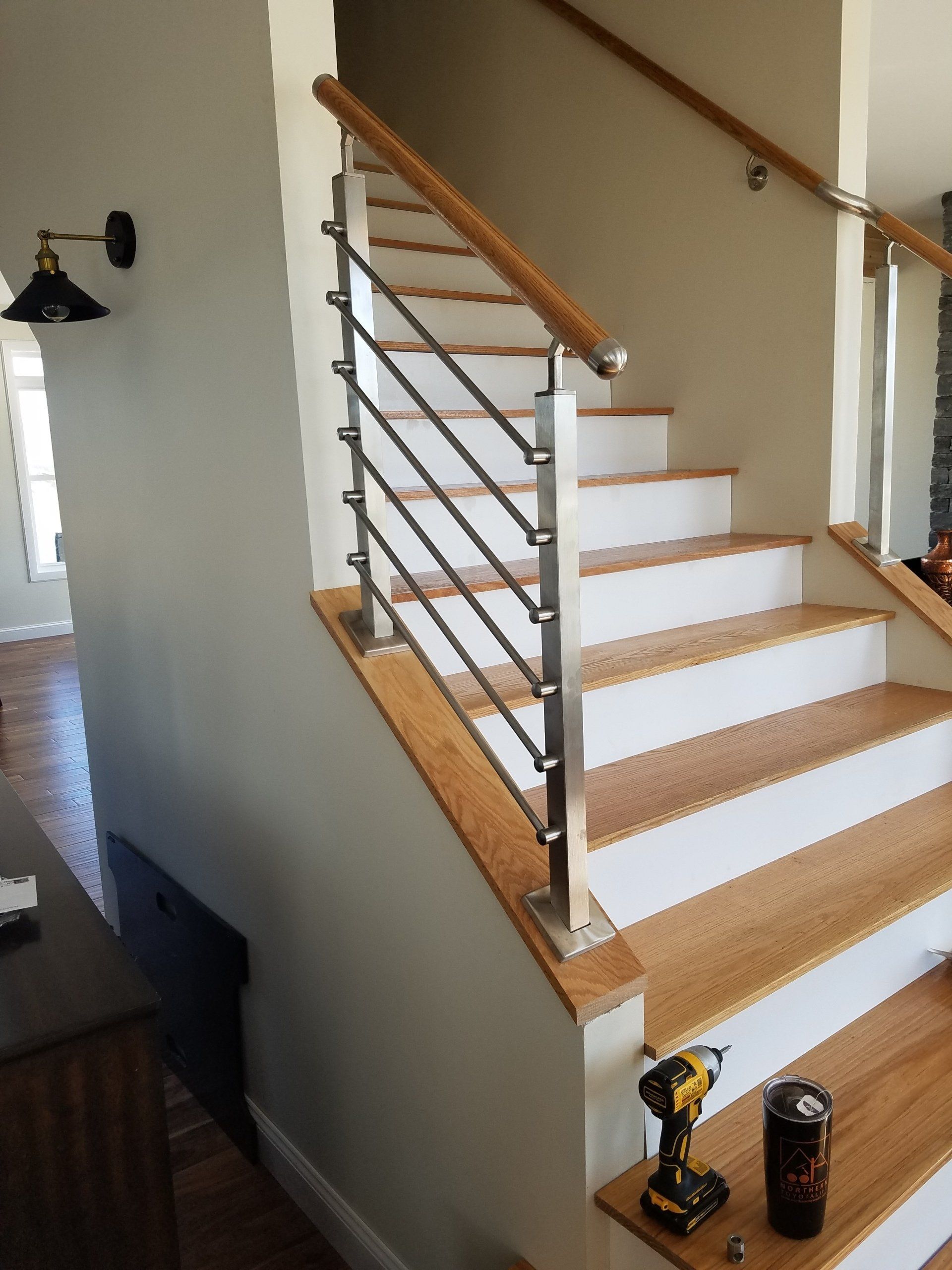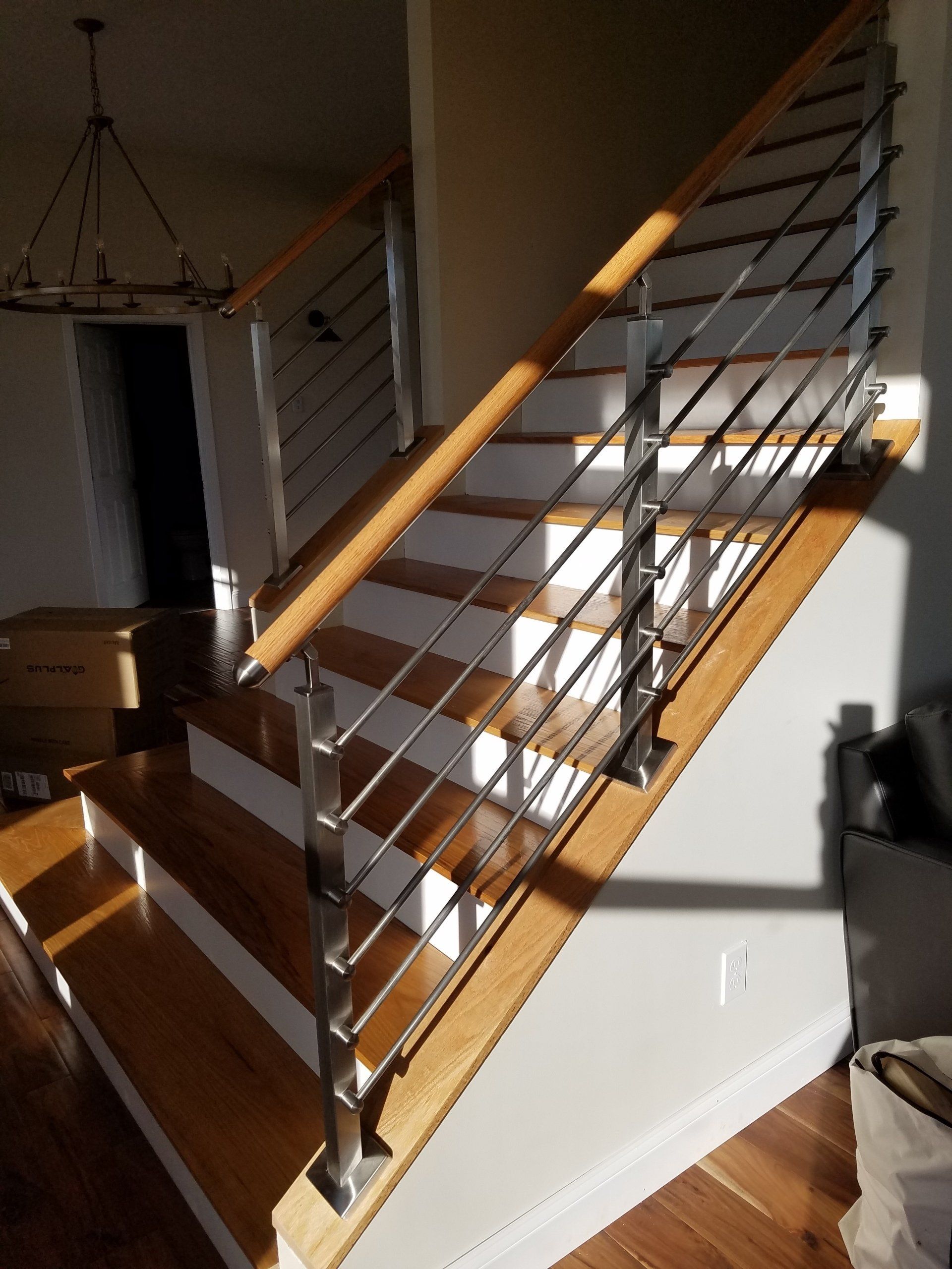 A beautiful stainless and red oak handrail to complete this elegant set of red oak stairs for a customer in Essex.