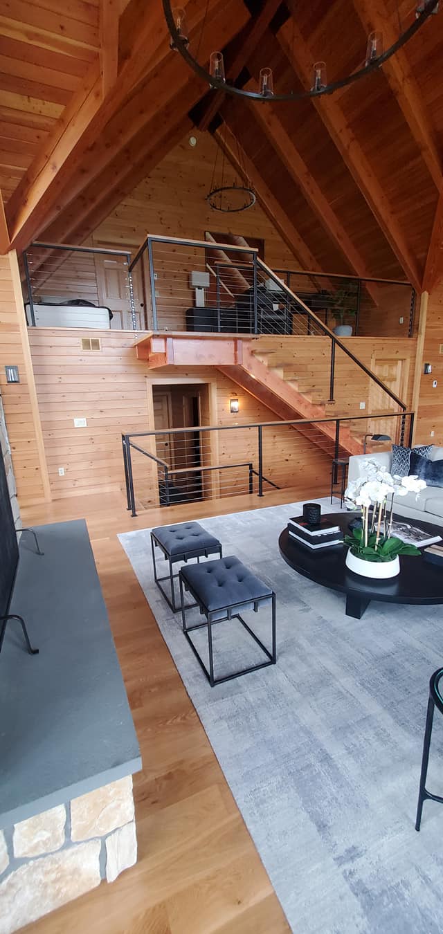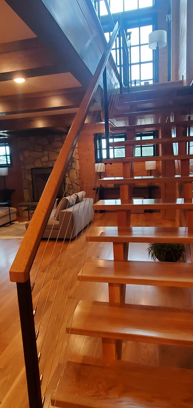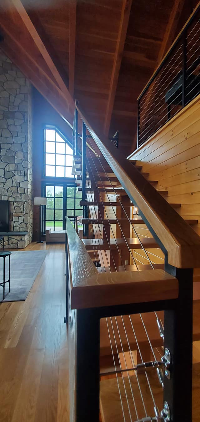 This is a beautiful cable handrail we designed and installed in a house in a Burke. The maple oak caps were added to give the handrail a more finished look and tie it in with the rest of the house.