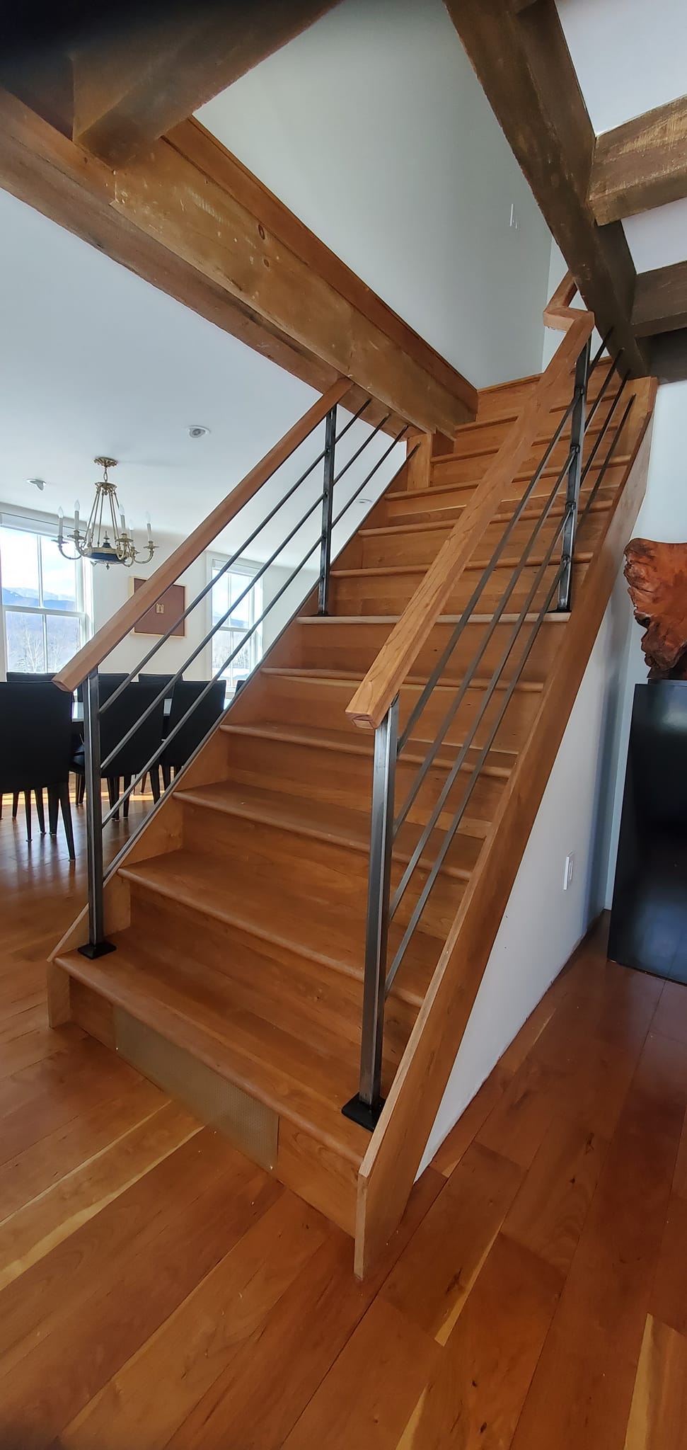 This project is a spectacular Cherry stair set in an absolutely beautiful completely renovated farm house in Warren. We went with 1.25" newel posts and .625" horizontal balusters to keep it minimal and open.