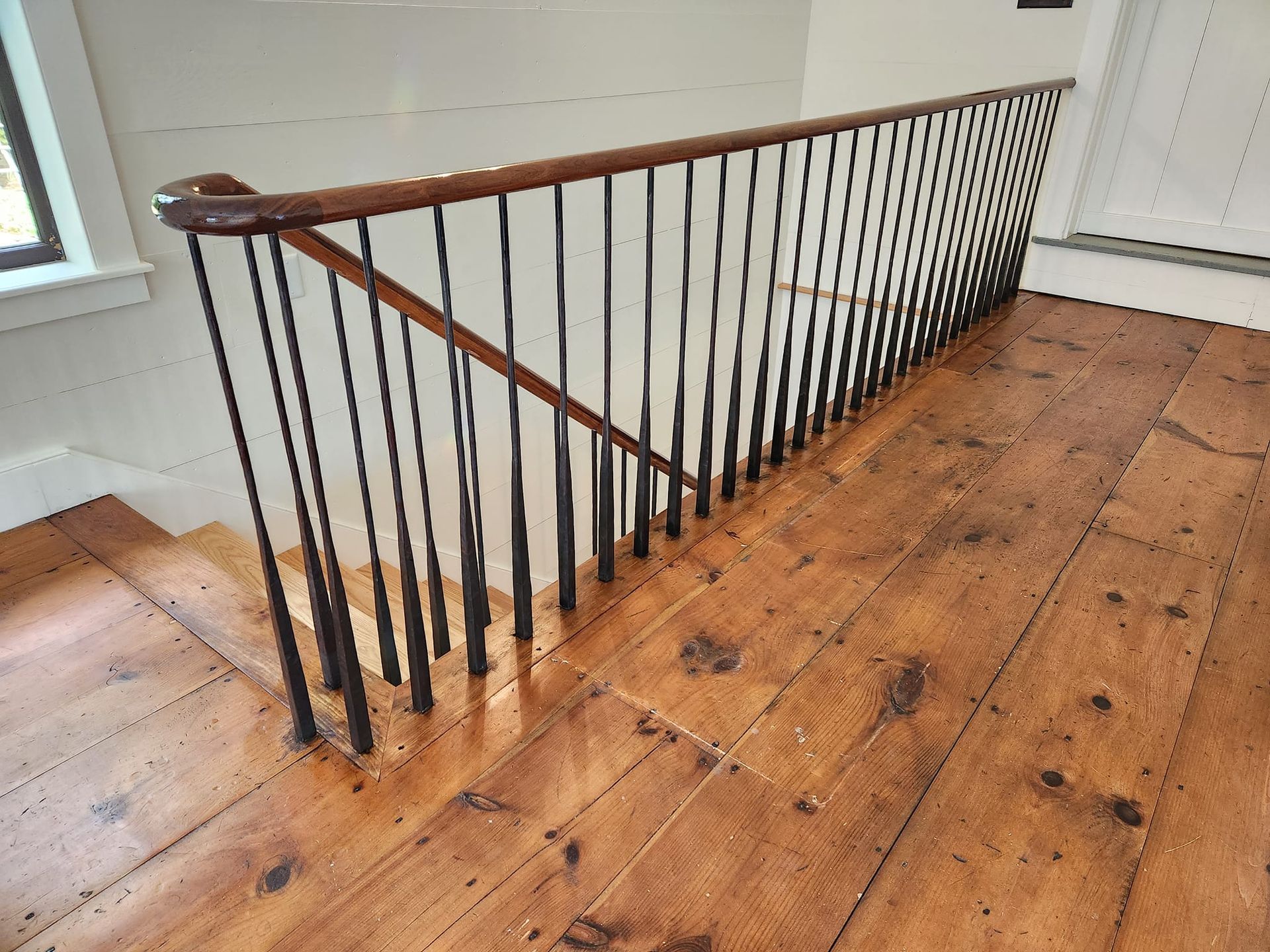 Completed this very unique solid walnut railing with hand forged iron balusters.