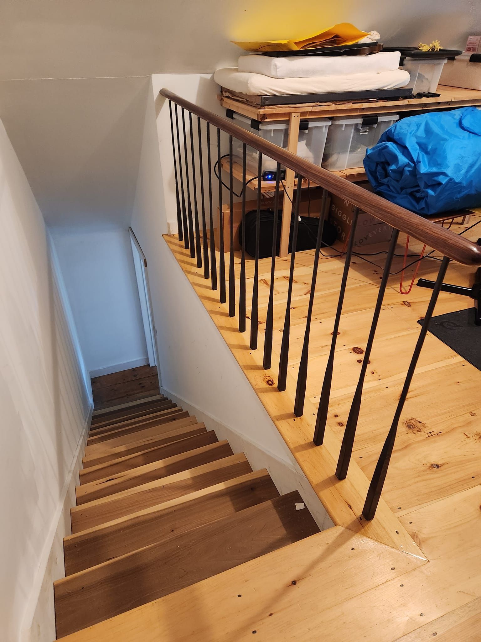 The balusters are finished with linseed oil and the oval walnut railing has satin polyurethane.