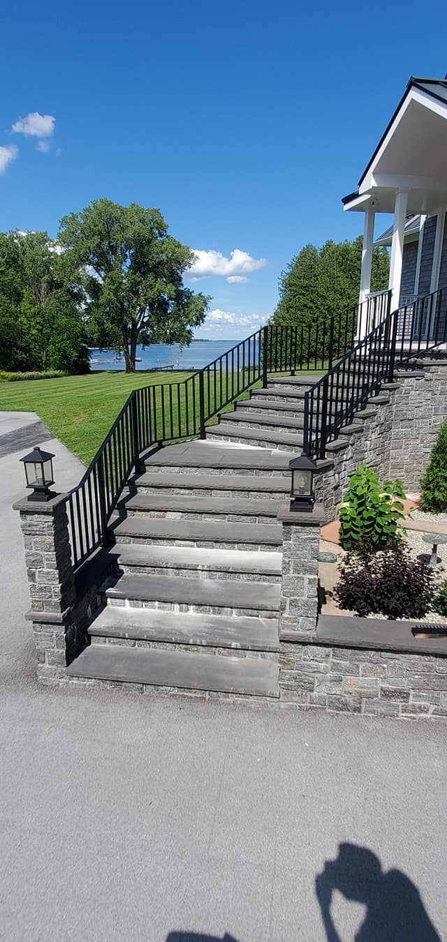 After almost a month of hard work and working with Lake front weather and the weather in general our scope of this beautiful handrail project is complete. The owner is adding an IPE wooden cap to match his douglas fir front door and porch to finish it off...