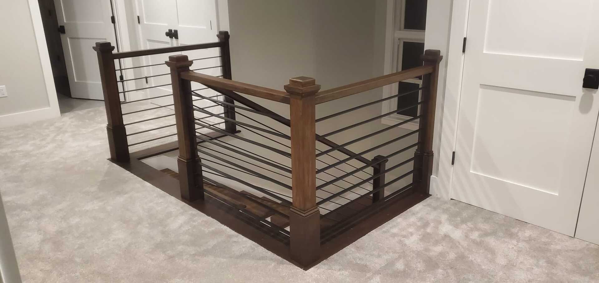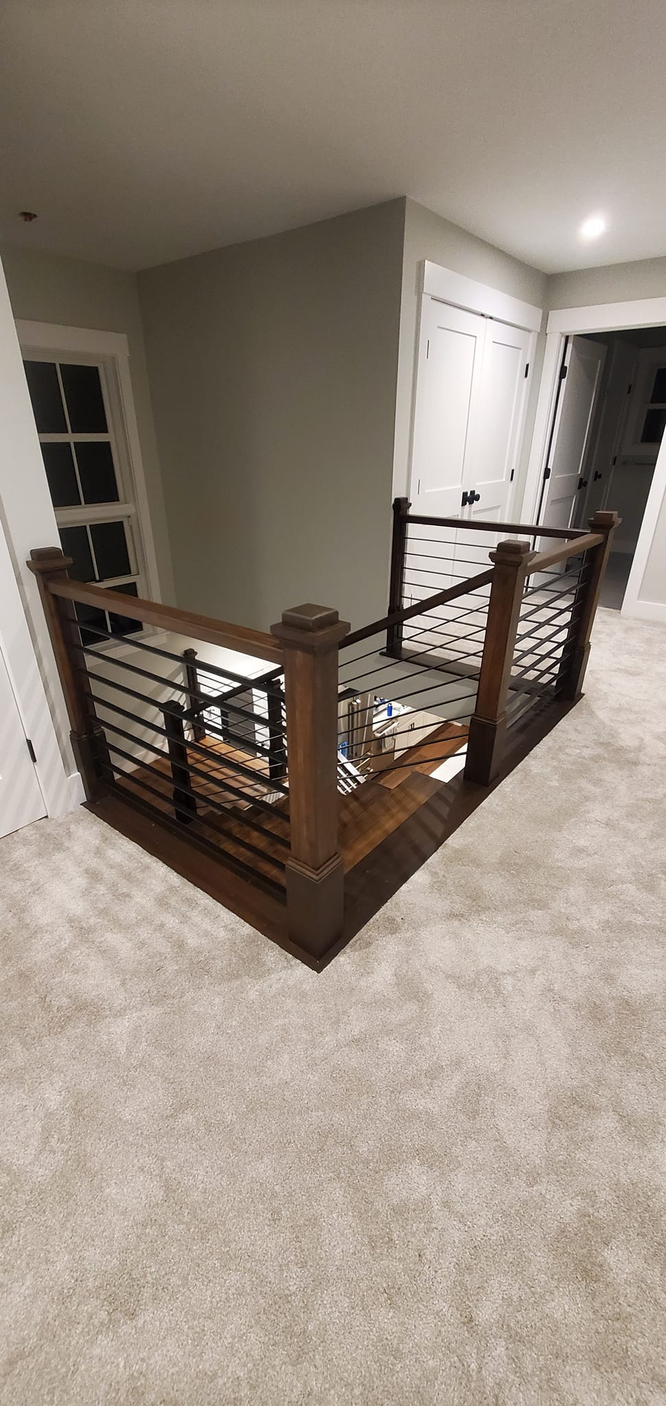 This time a spectacular Hickory boxed newel post and solid handrail finished in Dark Walnut stain with 1 x 1/4" metal inserts finished in Satin Black for this stunning new massive colonial in Stowe.